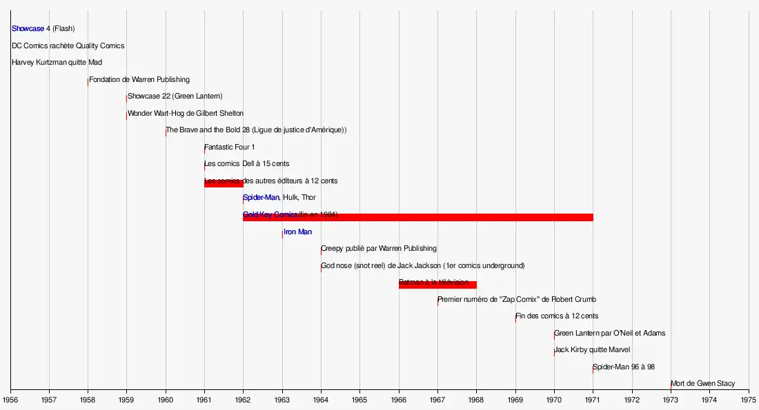 Après la Seconde Guerre mondiale, les comics de super-héros perdent leur lectorat au profit des comics d'horreur, des crime comics et des comics romantiques. Dans les années 1950, ces trois genres disparaissent à leur tour. De nombreux éditeurs sont alors dans la tourmente, avec l'instauration d'une instance de régulation qui, de fait, oblige les éditeurs à se censurer. Puis, c'est la disparition de la première société de distribution qui fragilise encore plus la profession. Il faut attendre 1956 pour que renaissent les comics de super-héros avec l'apparition d'une nouvelle version de Flash, dans Showcase no 4 (octobre 1956) publié par DC Comics. Bientôt suivie par la recréation de nombreux héros et le regroupement de plusieurs d'entre eux au sein de la Ligue de justice d'Amérique, cette résurrection est le point de départ de l'âge d'argent. D'autres éditeurs essaient alors de copier DC et c'est Marvel, sous la direction de Stan Lee, qui y parvient le mieux en lançant Les Quatre Fantastiques dans Fantastic Four no 1, publié en août 1961.