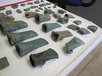 Les premières haches en bronze, fabriquées par moulage, s'inspiraient dans leur forme des haches en pierre polie du Néolithique. Par la suite, elles ont incorporé une cavité, permettant d'y glisser le manche en bois, et un petit anneau pour pouvoir attacher une lanière de consolidation. On trouve souvent dans les fouilles des groupes de haches en bronze non usées, suggérant d'éventuels dépôts rituels ou bien l'appropriation des outils de bronze par quelques individus privilégiés. On a aussi trouvé de nombreuses épées de bronze en forme de feuille élancée, en compagnie de pointes de lances et de flèches en bronze.