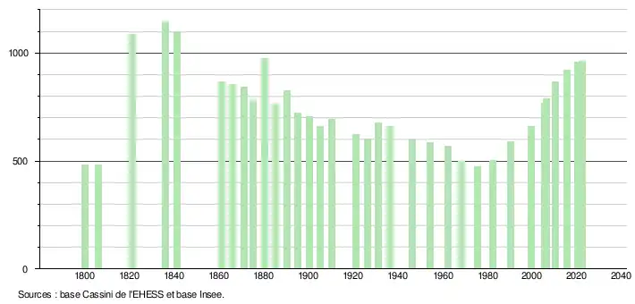 L'évolution du nombre d'habitants est connue à travers les recensements de la population effectués dans la commune depuis 1800. Pour les communes de moins de 10 000 habitants, une enquête de recensement portant sur toute la population est réalisée tous les cinq ans, les populations de référence des années intermédiaires étant quant à elles estimées par interpolation ou extrapolation[18]. Pour la commune, le premier recensement exhaustif entrant dans le cadre du nouveau dispositif a été réalisé en 2005[19].