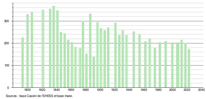 L'évolution du nombre d'habitants est connue à travers les recensements de la population effectués dans la commune depuis 1793. Pour les communes de moins de 10 000 habitants, une enquête de recensement portant sur toute la population est réalisée tous les cinq ans, les populations de référence des années intermédiaires étant quant à elles estimées par interpolation ou extrapolation[20]. Pour la commune, le premier recensement exhaustif entrant dans le cadre du nouveau dispositif a été réalisé en 2007[21].