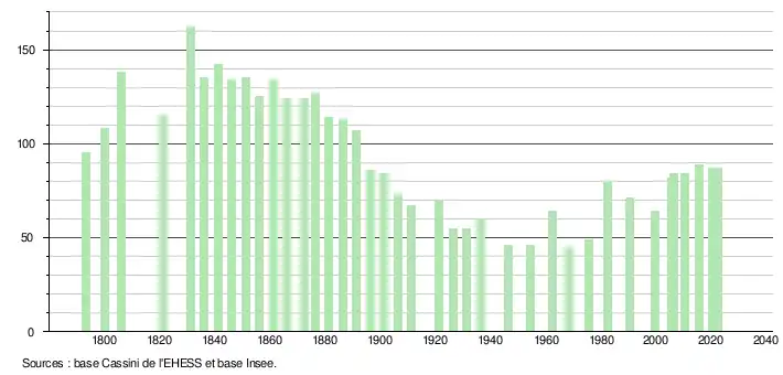 L'évolution du nombre d'habitants est connue à travers les recensements de la population effectués dans la commune depuis 1793. Pour les communes de moins de 10 000 habitants, une enquête de recensement portant sur toute la population est réalisée tous les cinq ans, les populations de référence des années intermédiaires étant quant à elles estimées par interpolation ou extrapolation[18]. Pour la commune, le premier recensement exhaustif entrant dans le cadre du nouveau dispositif a été réalisé en 2005[19].