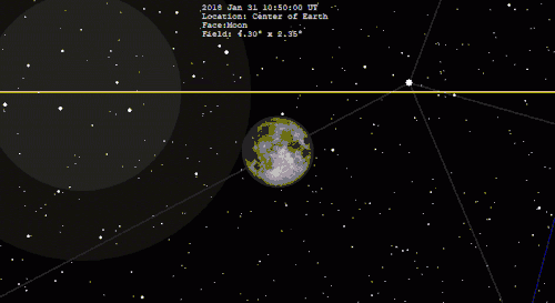 Cette simulation animée montre l'apparence approximative de la Lune passant dans l'ombre de la Terre durant cette éclipse. La partie septentrionale de la Lune est proche du centre de l'ombre, qui rend cette partie la plus sombre.