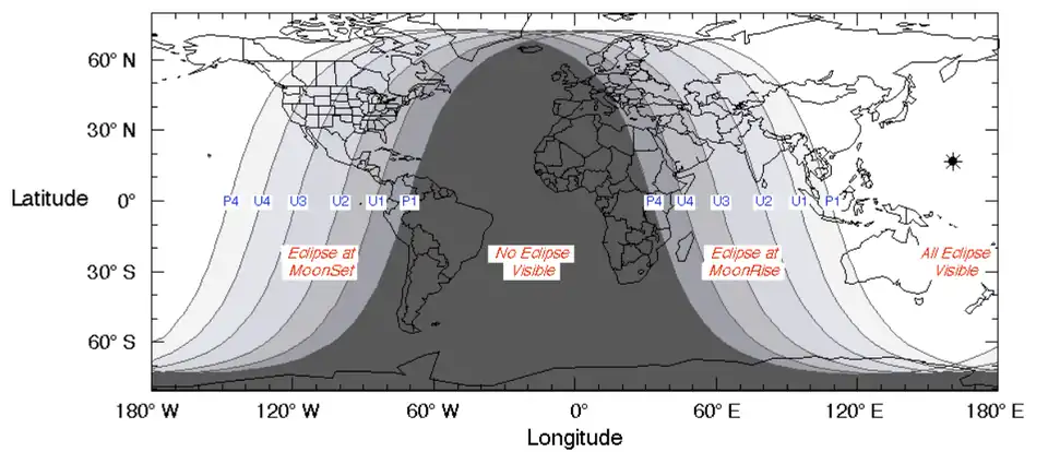 L'éclipse est visible depuis une majeure partie de l'océan Pacifique qui est tourné vers la Lune lors de cette éclipse. L'Asie centrale et orientale (dont la Sibérie), l'Indonésie, la Nouvelle-Zélande et la majeure partie de l'Australie ont une vue complète de cette éclipse après le coucher du soleil.