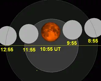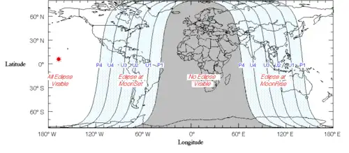 L'éclipse fut visible dans son intégralité dans le Pacifique Nord. Depuis l'Amérique du Nord, l'éclipse fut observable après minuit le Mercredi ; et l'éclipse fut observable depuis l'ouest du Pacifique, l'Australie, l'Indonésie, le Japon, et l'est de l'Asie après le coucher du Soleil dans la soirée du .