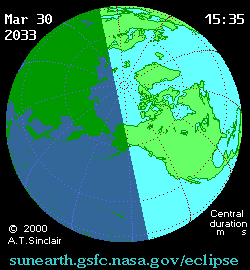 Cette éclipse totale commencera à l'extrême nord de l'océan Pacifique, décrira une boucle qui touchera en premier la côte ouest de l'Alaska, puis passera par le détroit de Béring que l'éclipse couvrira entièrement. Continuant vers le nord, l'éclipse quittera l'Alaska par la côte nord, elle aura son maximum pas loin de cette côte dans l'océan Arctique. Ensuite l'éclipse continuera sa boucle sur cet océan pour finir à environ 500 km du pôle Nord.