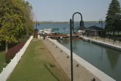 À l’occasion, si le débit du cours d’eau est suffisant, une écluse sans barrage permet de racheter un courant trop fort : à Buffalo, sur la rivière Niagara, celle de Black Rock (en)[14] contourne les vigoureux rapides du pont de la Paix à l’International plus au nord. Sur les trois-quarts du parcours de quelque deux milles nautiques, l’île est prolongée vers l’amont par des épis pour assurer un apport d’eau suffisant jusqu’à l’écluse. Le « rachat » de la chute moyenne de 5,2 pieds (±1,5 m) permet aux « petits » bâtiments d’accéder à Tonawanda à quelque 12 km de là à la rivière canalisée du même nom, puis, après moins de 40 km d’un plan d’eau à « l’étale », aux deux premières écluses du Canal Érié à Lockport.