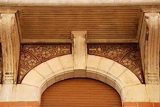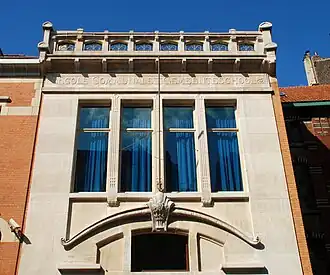 La façade du premier étage présente un ensemble de quatre grandes baies rectangulaires séparées par d'élégants motifs sculptés plutôt typiques de l'Art nouveau géométrique.