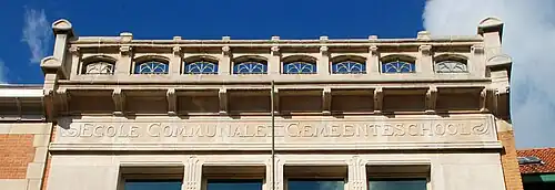 La façade se termine par un entablement dont l'architrave porte la mention « École communale - Gemeenteschool » et dont la corniche supporte un élégant parapet de pierre ajourée.