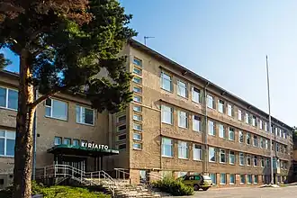 Le bâtiment scolaire, conçu par l'architecte municipal Totti Sora, compte deux étages. Ses façades sont crépies et le toit en pente est recouvert de briques. Les caractéristiques typiques des années 1950 sont les surfaces en ardoise, les plafonds intérieurs lambrissés, les portes laquées et les balustrades métalliques avec des mains courantes en bois laqué[1].
