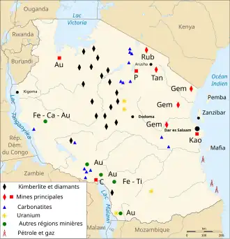 La Tanzanie dispose d'un sous-sol relativement riche et, surtout, encore largement sous - voire non exploité : métaux pauvres (fer, nickel) et nobles (or), diamants et pierres précieuses (dont certaines, telle la tanzanite, ne sont trouvées que dans la région), charbon, uranium, ainsi que divers minerais industriels comme le kaolin, le gypse ou les phosphates. Des dépôts de gaz, pétrole et cobalt ont également été repérés.