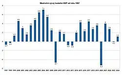 En 2023, le produit intérieur brut (PIB) tchèque par habitant en parité de pouvoir d'achat était de 50 961 $ et de 698 706 couronnes tchèques (31 368 $) en valeur nominale. En septembre 2021, le taux de chômage en République tchèque était le plus bas de l'UE à 2,6 %, et le taux de pauvreté est le deuxième plus bas des membres de l'OCDE, après le Danemark. La République tchèque se classe 21e dans l'indice de liberté économique (derrière le Chili), 30e dans l'indice mondial de l'innovation (derrière les Émirats arabes unis), 32e dans le rapport sur la compétitivité mondiale, 41e dans l'indice de facilité de faire des affaires et 25e dans le rapport mondial sur la facilitation du commerce (derrière le Canada).[39]