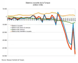 La consommation privée soutenue, le taux d'investissements élevé et le déficit de la balance commerciale ont conduit le pays à recourir aux flux de capitaux étrangers (IDE et investissements de portefeuille). Le taux d'épargne (14,5 % du PIB[13]) bien que supérieur à celui du Royaume-Uni (12,9 %) ou des États-Unis (11,6 %) ne suffisait pas à apporter les sommes nécessaires au développement économique du pays. La vigueur de l'économie turque en 2010 s'est accompagnée de tensions inflationnistes (+8,7 %).
