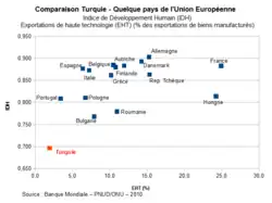 - d'exporter des produits à forte valeur ajoutée pour retrouver un équilibre de sa balance commerciale (les exportations de produits de haute technicité représentent 1,93 %[13] des exportations de biens manufacturés en Turquie contre 11,2 % pour le Brésil et 15,2 % pour l'Allemagne).