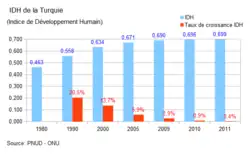 En 2010, la Turquie était la 15e puissance économique mondiale relativement au PIB[24], mais pour ce qui est de l'indice de développement humain, le classement était moins favorable et montrait que la Turquie devait intensifier ses investissements dans l'éducation, la recherche et la santé et mener des politiques moins inégalitaires[réf. nécessaire]. En 2011, l'IDH de la Turquie se montait à 0,762[25]. Au niveau mondial, la Turquie était classée 75e. En 2023 elle est classée 45ème.