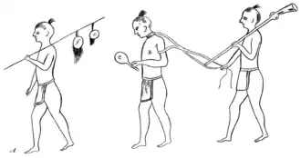 Les hommes s'exerçaient aux tactiques collectives lors des expéditions guerrières[27]. Leurs autres tâches, comme la chasse et la pêche, comportaient aussi des éléments de coopération, avec cette différence qu'ils se regroupaient par village entier plus souvent que par clan, comme le faisaient les femmes[28]. Pendant les parties de chasse qu'ils organisaient, des techniques collectives étaient mises en œuvre pour abattre une grande quantité de gibier. Un témoignage de première main décrit une battue pour laquelle une grande barrière de broussailles en forme de V avait été construite dans la forêt. Les rabatteurs mirent le feu du côté ouvert du V, forçant les animaux à courir jusqu'au point où les chasseurs du village les attendaient devant une ouverture[29]. Une centaine de cervidés pouvaient être abattus en une seule fois avec un tel procédé[30],[29].