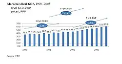 | Évolution du PIB du Maroc (IMF)[42] | 2004 | 2005 | 2006 | 2007 | 2008 | 2009 | 2010 | 2004–2010 |