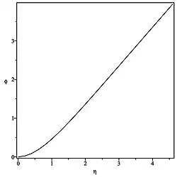 Si l'on prend pour définition de l'épaisseur de couche limite , l'épaisseur de celle-ci (voir courbe) est donnée par .
