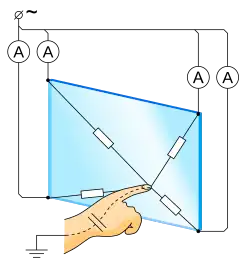 Dans les systèmes capacitifs[6], une couche qui accumule les charges, à base d'indium, métal de plus en plus rare, est placée sur la plaque de verre du moniteur. Lorsque l’utilisateur touche la plaque avec son doigt, certaines de ces charges lui sont transférées. Les charges qui quittent la plaque capacitive créent un déficit quantifiable. Avec un capteur à chacun des coins de la plaque, il est possible à tout moment de mesurer et de déterminer les coordonnées du point de contact. Le traitement de cette information est le même que pour les circuits résistifs.