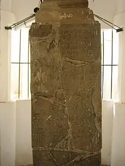 Les plus anciennes inscriptions en birman remontent au XIIe siècle. Sur la pierre de Myakan[2] (début du XIIe siècle), trouvée à Bagan, un texte en môn comporte quelques mots en birman indiquant le nom d'un lac artificiel creusé sous le règne de Kyanzittha. Mais le plus ancien document d'écriture birmane connu à ce jour est gravé sur la stèle quadrilingue dite de Myazedi[4] ou de Razakuma(r) (1113)[5], qui commémore la fondation d'une pagode par ce prince, avec mention du donateur et de ses présents.