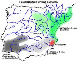 À l'exception de l'alphabet gréco-ibérique, et dans une moindre mesure, de cette écriture, les écritures paléo-iberiques partagent une typologie distinctive : elles se comportent comme des syllabaires pour les consonnes occlusives et comme des alphabets pour les autres consonnes et voyelles. Ce système d'écriture unique a été appelé semi-syllabaire. Il n'y a pas d'accord sur la genèse des semi-syllabaires paléo-hispaniques ; certains chercheurs concluent que leur origine est liée uniquement à l'alphabet phénicien, tandis que d'autres croient que l'alphabet grec y a également participé. Dans l'écriture du sud-ouest, bien que la lettre utilisée pour écrire une consonne occlusive soit déterminée par la voyelle qui la suit, comme dans un syllabaire, la voyelle suivante était également écrite, comme dans un alphabet. Une convention similaire est trouvée en étrusque pour /k/, qui était écrit KA CE CI QU (sc) suivant la voyelle qui suivait. Certains chercheurs traitent le tartessien comme un semi-syllabaire redondant, d'autres le traitent comme un alphabet redondant.