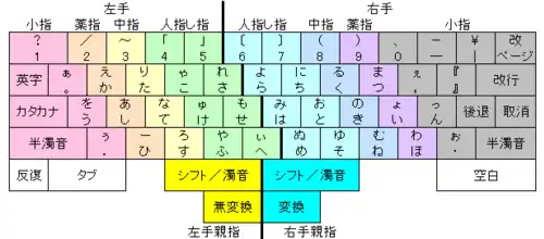 Kanji est en rouge, hiragana en orange, katakana en vert, rōmaji et chiffres arabes en noir :