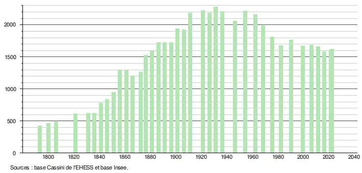 L'évolution du nombre d'habitants est connue à travers les recensements de la population effectués dans la commune depuis 1793. Pour les communes de moins de 10 000 habitants, une enquête de recensement portant sur toute la population est réalisée tous les cinq ans, les populations de référence des années intermédiaires étant quant à elles estimées par interpolation ou extrapolation[16]. Pour la commune, le premier recensement exhaustif entrant dans le cadre du nouveau dispositif a été réalisé en 2006[17].