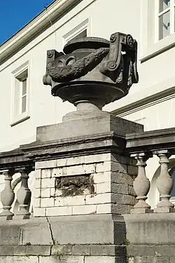 À l'ouest, la balustrade continue cède la place à un mur de clôture en pierre blanche rythmé par une alternance de balustrades, de piliers forts surmontés de statues et de piliers faibles surmontés de vases de pierre ornés de têtes de lion, de draperies et de guirlandes de laurier, semblables aux vases de pierre du mur de clôture du palais, à côté de l'Hôtel de la Liste civile de l'autre côté de la rue Ducale.