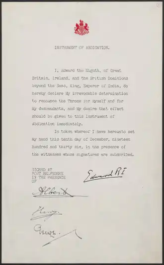 Édouard VIII informa Baldwin qu'il abdiquerait s'il ne pouvait pas épouser Wallis Simpson. Baldwin présenta trois possibilités à Édouard VIII : abandonner l'idée du mariage, se marier contre l'avis de ses ministres ou abdiquer[52]. Il était clair qu'Édouard VIII n'était pas prêt à abandonner Wallis Simpson et il savait que s'il se mariait contre l'avis de ses ministres, il causerait la démission du gouvernement et une crise constitutionnelle[53]. Il choisit donc d'abdiquer[54].