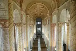 Pseudo-basilique : la nef centrale a un étage de plus que les collatéraux, mais pas de fenêtres supplémentaires.