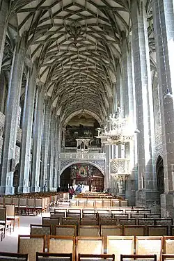 Église-halle échelonnée : la nef centrale est un peu plus haute que les collatéraux, mais elle n'a pas d'étage supplémentaire.