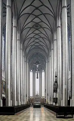 Quant au vaisseau central, en l'absence des fenêtres hautes, il est éclairé indirectement par la lumière provenant des nefs latérales. L'église-halle se rapproche de la conception d'une vaste salle hypostyle voûtée.