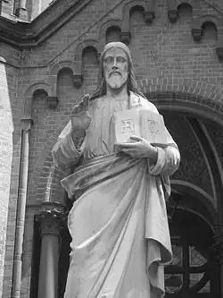 Le clocher, situé en façade ouest, a une base carrée et est surmonté d'une flèche de 62 mètres couverte en cuivre. Il surmonte le portail d'entrée en plein cintre.