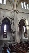 - Les stalles : le long des côtés nord et sud du chœur, des stalles réalisées en bois de chêne restent en place. Leur datation reste discutée (XVIIIe siècle ou XIXe siècle[22]). Elles présentent d'intéressantes miséricordes, petits supports permettant de prendre appui pour soulager une longue sation debout.
