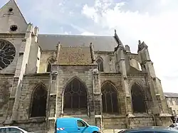 Avec ses hautes fenêtres au réseau rayonnant, les contreforts fortement saillants scandés par de multiples larmiers, sommés par des pinacles et garnis de grandes chimères, le chœur est sans doute la partie la plus impressionnante de l'église. Il paraît en même temps sévère et raid. La corniche de feuilles entablées est la même que sur la façade. La balustrade à jour, constituée par des arcatures trilobées, paraît conforme à l'esprit rayonnant et évite les lourdeurs qui entachent fréquemment les créations néogothiques. Elle ne date que des années 1880, et ne semble pas succéder à une balustrade médiévale. À côté du gros volume du chœur, les chapelles latérales paraissent insignifiantes. Elles surprennent par leur chevet arrondi et leurs toits coniques, qui laissent davantage de place aux baies latérales des croisillons. Les pinacles au sommet des contreforts ont disparu, sauf ceux qui jouxtent immédiatement le chœur[28].