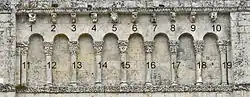 À l'extérieur de l'église : un cadran canonial sur le mur sud de la nef. Ce type de cadran solaire primitif était utilisé par le clergé pour déterminer le moment dans la journée pour pratiquer certains actes liturgiques.