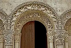 La voussure externe du portail central s'appuie sur des hauts chapiteaux historiés reposant sur des colonnes courtes et larges contrastant avec les colonnettes voisines.