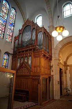 Le premier grand orgue se trouvait dans le chœur et masquait le fond de l'église[4]. Il comportait douze jeux.Il fonctionnait très mal en 1922, date de sa transformation. Il doubla son nombre de jeux qui passa à 23. Il avait été fabriqué en 1896 par le facteur Stoltz. Il fut inauguré en mars 1897. L'orgue transformé est réinstallé dans la tribune et est inauguré en 1923. Il est inondé en 1975. Un nouveau petit orgue est installé dans le transept sud mais tombe définitivement en panne en 2002. Un nouveau grand orgue est construit en 2009 à l'emplacement du précédent par le facteur Olivier Chevron.