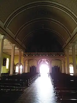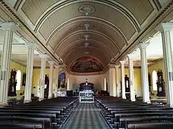 L'intérieur de l'église est composé d'une grande nef couverte en berceau et de deux collatéraux. La nef comprend six travées encadrées de colonnes supportant les architraves sur lesquelles repose la voûte en berceau en bois peint de la nef.