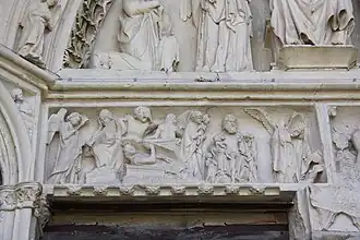 Les panneaux en relief situés au-dessous représentent les travaux des mois, tandis que les panneaux extérieurs montrent la Présentation au Temple sur la gauche et l'Adoration des Mages sur la droite.