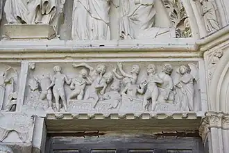 Le tympan est dédié au Jugement dernier. Au milieu, entouré d'anges, le Christ est intronisé en tant que juge du monde. Juste au-dessous, sur le linteau, les morts sortent de leurs tombes pour être jugés. Au-dessus du tympan s'arquent des archivoltes décorées de baguettes rondes, de feuillages et de figures d'anges.