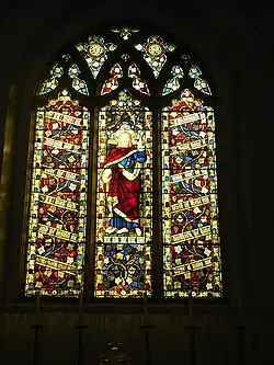 Le mur du chevet est orné d’un vitrail de grande dimension illustrant le thème de paroles de Jésus : « Je suis la vraie vigne » (Jn 15 :1).