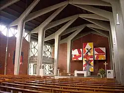 L'église se présente sous la forme d'une église-halle moderne, en briques et en béton, avec un haut clocher séparé. L'intérieur est éclairé par des baies lumineuses et soutenu par des arcatures de béton armé donnant une impression de légèreté et de modernisme. Au fond une lourde croix expressionniste et colorée décore le chœur. L'architecture fonctionnelle de cette église est typique de l'architecture fonctionnelle des années 1950-1960. Le décor est largement dû à Gerd Winner.