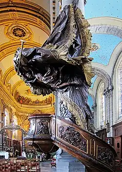 La chaire à prêcher est en bois de chêne taillé avec un décor en demi-relief sculpté en 1768 par Jean-Baptiste Danezan. C'est un véritable petit bijou : les drapés d'une tapisserie suspendue dominent un ange tenant à la main droite une croix et dans la main gauche une trompette. C'est l’ange de la Vérité qui soulève le voile de l’erreur pour révéler les Vertus théologales représentées sur la cuve : la Foi (symbolisée par la croix), l’Espérance (tenant l’ancre) et la Charité (une femme allaitant deux enfants). La rampe de l'escalier de la chaire comporte une allégorie de la Vérité naturelle (un érudit qui compulse un livre ouvert sur une souche desséchée) et une représentation du Triomphe de la Foi (une femme qui tient un ostensoir entourée de têtes d'anges).