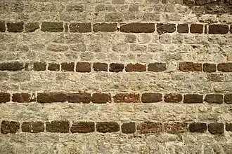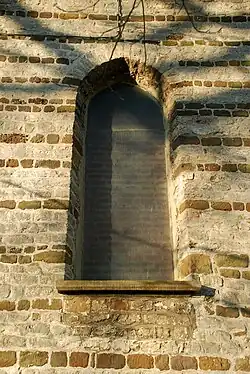 L'appareil alterné blanc et brun du chevet se prolonge partiellement sur les murs des collatéraux avant de céder la place à la maçonnerie du XXe siècle.