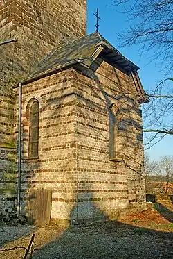 Dominant le chevet, l'église conserve un clocher roman présentant une maçonnerie faite principalement de moellons de grès ferrugineux assemblés en appareil irrégulier et parsemée de blocs de grès blanc, sauf la base qui est uniformément blanche.