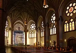 Toute l'ornementation intérieure est détruite à la fin de la Seconde Guerre mondiale et il ne reste plus rien des vitraux. Paul Brandenburg est l'un des principaux artistes rénovateurs de l'église dans les années 1950-1960, dont on remarque l'autel moderne et le grand crucifix en forme de croix grecque.