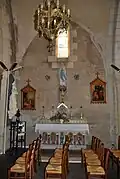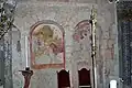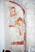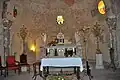 Sur le doubleau de la voûte, des motifs géométriques de couleur ocre rouge sur fond ocre jaune attestent l'existence d'un décor peint à l'époque romane. Dans la première moitié du XVIe siècle, le sanctuaire reçoit de nouvelles peintures représentant les quatre évangélistes. Saint Jean écrivant sous la dictée de son symbole, l'aigle, est bien conservé. Coiffé d'un turban rouge, le visage d'un second évangéliste est aussi visible. On peut penser que ces figures sous arcades complétaient le programme iconographique d'un retable. Sur les voûtes, il y a des traces de peintures : le soleil, la lune et un mandorle…