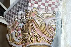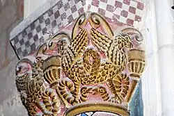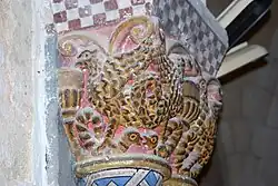 Il s'y trouve quatre doubles chapiteaux à corbeilles figurés. Ils datent d'un reconstruction partielle du chevet au XIIe siècle. Leur iconographie s'inspire de celle de l'abbaye de La Sauve-Majeure. Autour de l'autel, l'endroit la plus sacré de l'église, réservé aux clercs, on trouve des monstres et animaux maléfiques. Dans les églises romanes, l'imagerie réservé aux clercs se préoccupait davantage d'édification morale que de doctrine. Les quatre espèces représentées autour de l'autel : basilic, aspic, lion et dragon sont les quatre ennemis traditionnels de Dieu et de l'Homme — « Tu marcheras sur le basilic et l'aspic, tu fouleras aux pieds le lion et le dragon » (psaume 90) —. Ces bêtes ont été sculptées comme avertissement aux clercs qui servaient deux maîtres, approchant Dieu par le calice tout en restant asservis au Démon, métamorphosé en bête maléfique. L'archange saint Michel est là pour apporter l'espoir au pécheur.