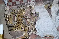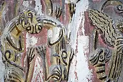 Un lion bi-corporé et androcéphale est aplati sur la première corbeille. Sa queue rentrée est tire-bouchonnée. Sur la deuxième corbeille, il y a un être angélique (archange Michel ?) qui foule aux pieds un dragon qu'il vient de transpercer.