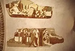 Un décor peint découvert lors de la restauration se présente en deux registres parallèles sur les versants nord et sud de la voûte du chœur. Les scènes représentées sont tirées de l'enfance du Christ : Annonciation, Visitation, Nativité au nord ; Fuite en Égypte et Adoration des mages au sud.